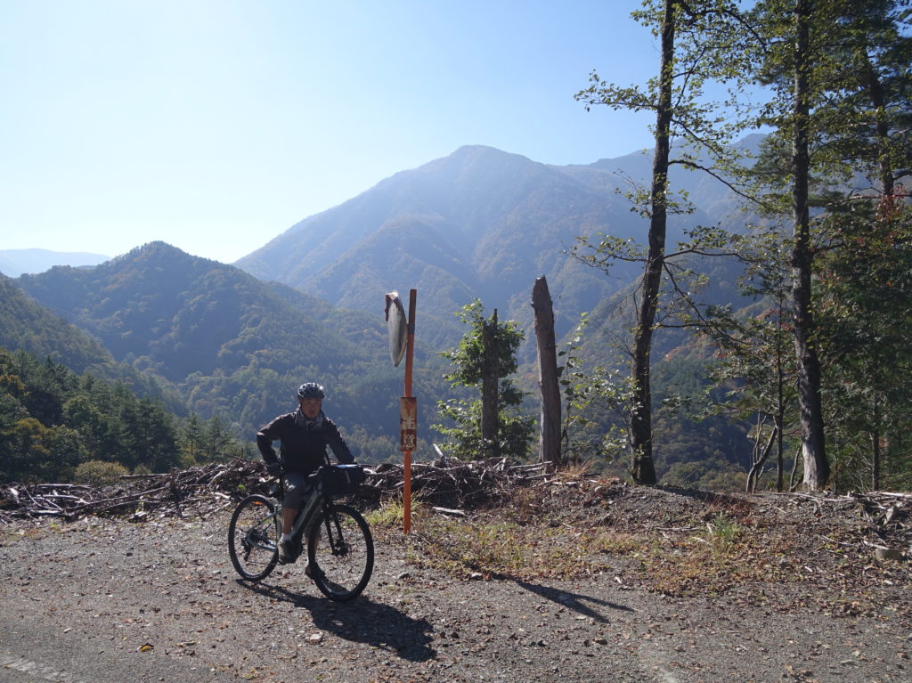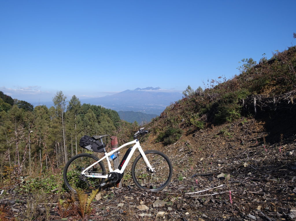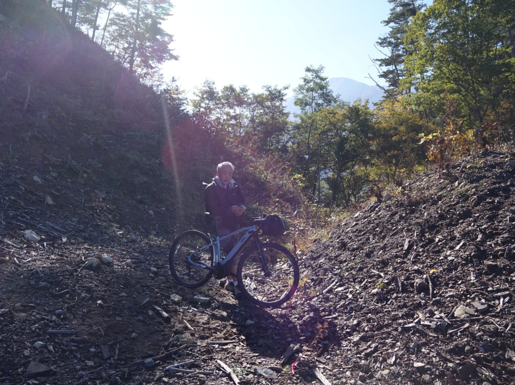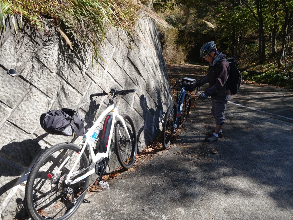 2台とも電力自転車だったので、上り坂もへっちゃらで色々と話しながらつらつらと上って行きました。林道も取っ付きはちょっと厳しい上りだったけど、中に入っちゃうと斜度もそれほどではなかったので、電力じゃなくても・・・と思う一面もあったけど、コース後半に出てきた、JR穴山駅越えのゲキサカでは、その有り難みを感じました。人力でこんな坂を最後に持ってこられたらきっと暴動が起きるに違いないと2人で話しながら上りました。